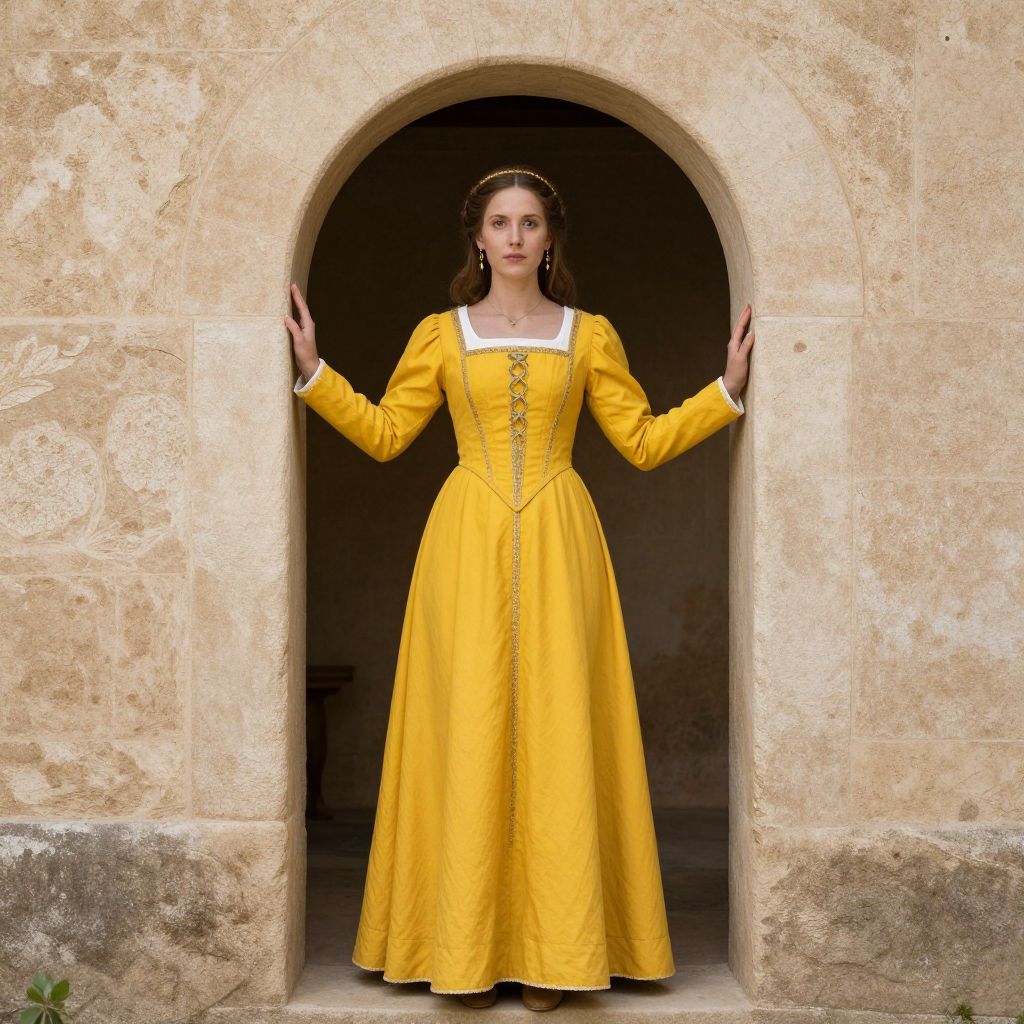 Medieval dress yellow, a woman in a yellow dress standing in an archway