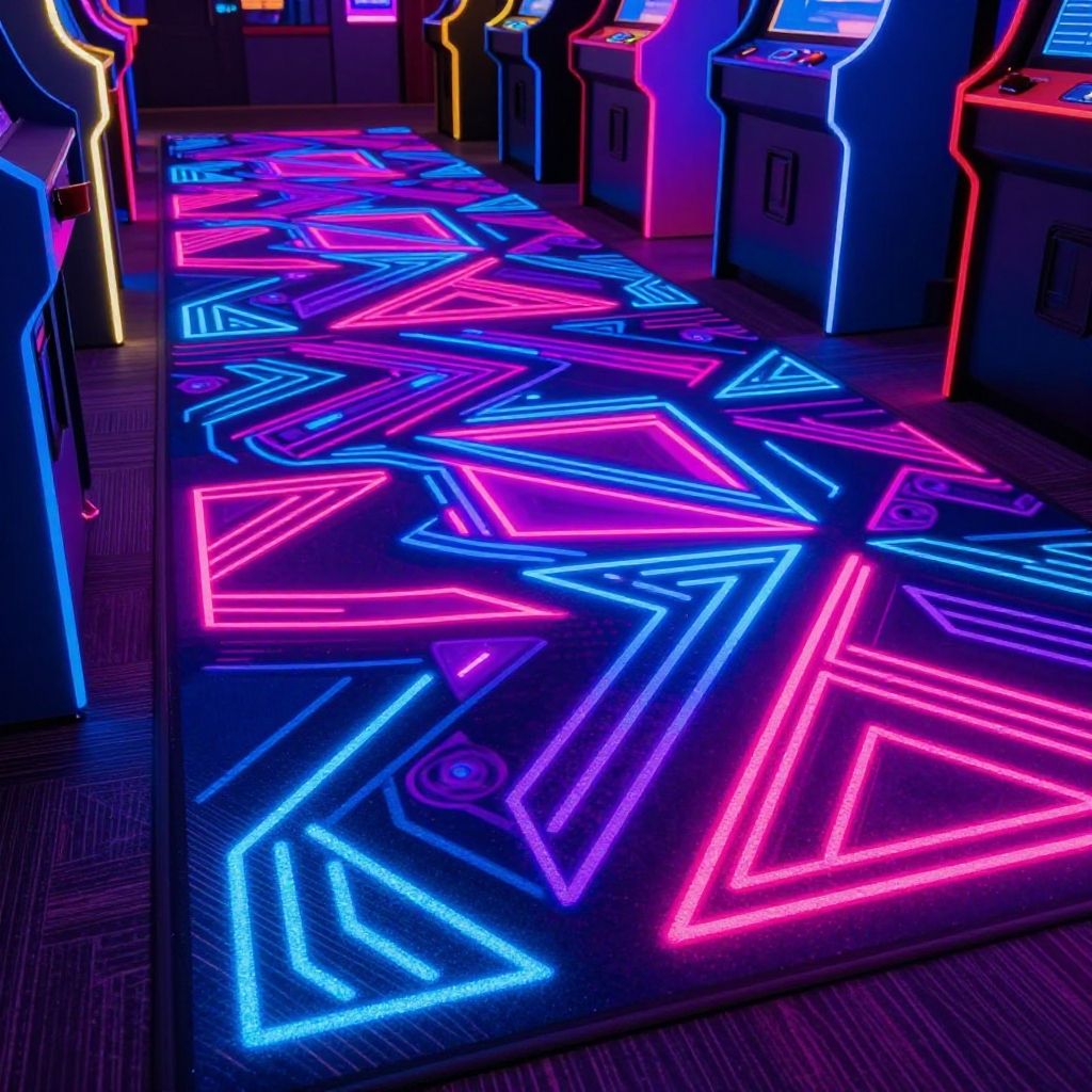 Neon arcade carpet glowing under vibrant retro arcade lights, geometric patterns with bright pinks, blues, and purples, futuristic nostalgia vibe, high detail, cinematic lighting