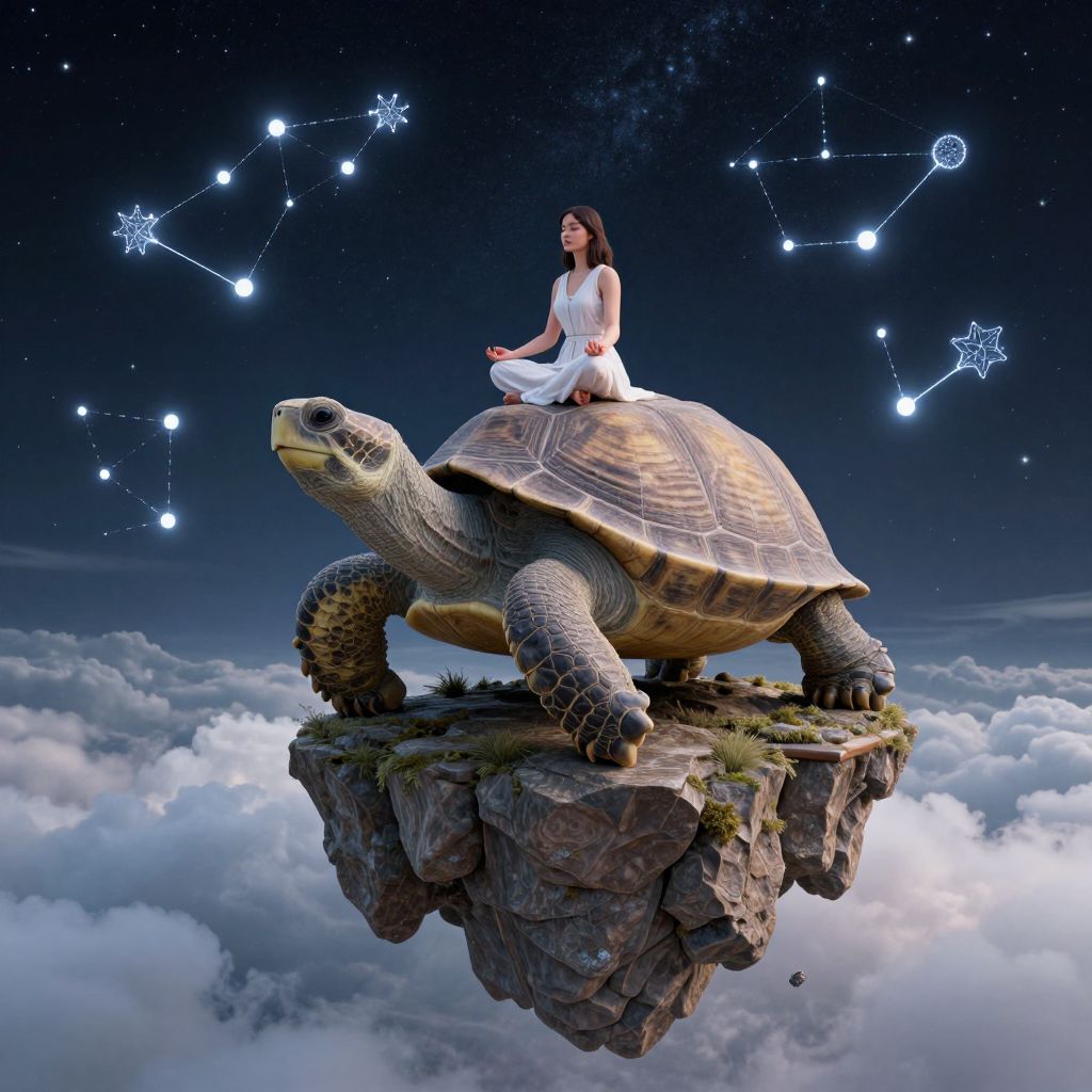 A surreal 3D-rendered scene depicts a colossal turtle perched atop a floating rocky pedestal amidst clouds, with a serene woman meditating on its shell, surrounded by ethereal constellations that shimmer against a starry night sky, blending fantasy and cosmic elements in a high-definition, otherworldly visual narrative.