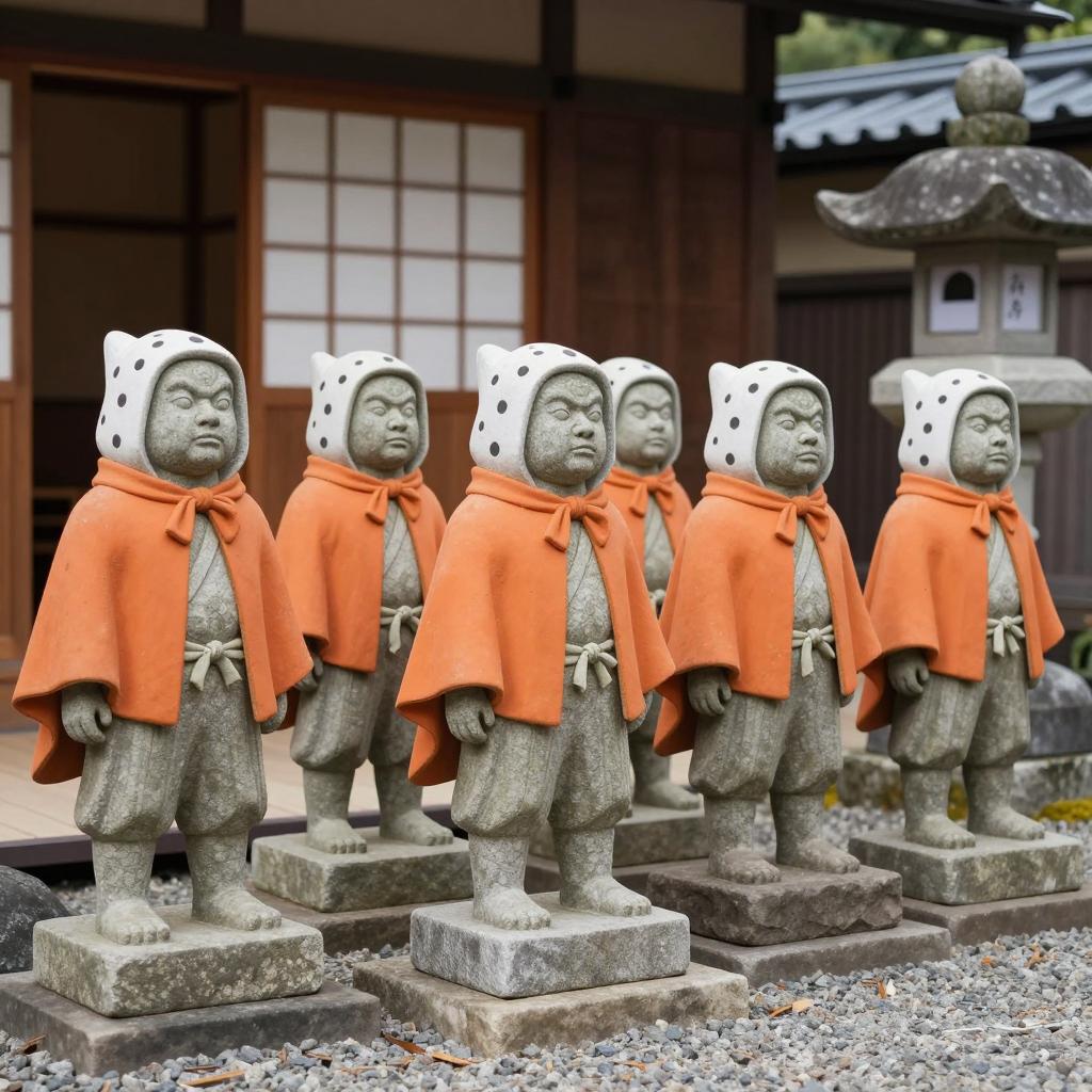 Six stone statues of traditional Japanese ogre-like figures wearing white polka-dotted hoods and orange cloaks, standing in a row on gravel in front of a wooden building with sliding doors. Each statue is on a rectangular stone base, facing forward with a neutral expression. A large stone lantern is in the background to the right.
