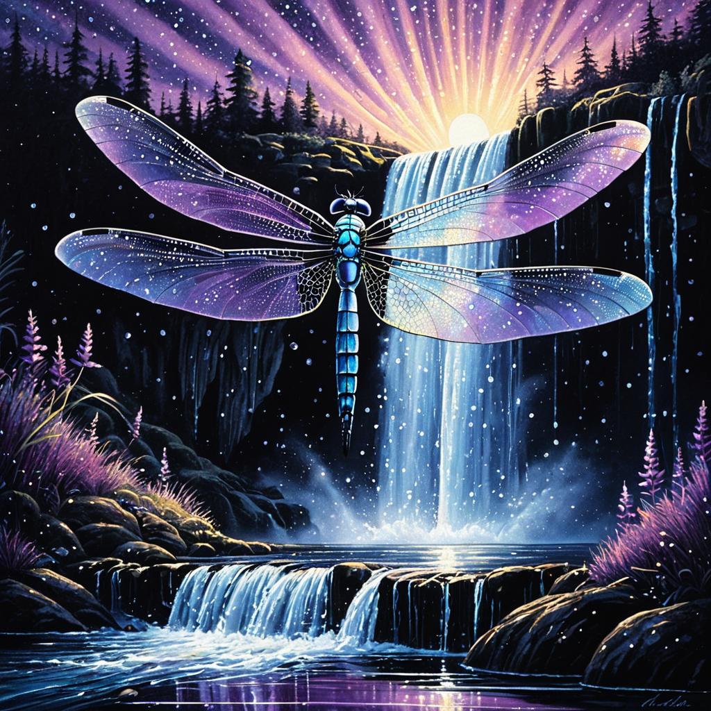 Bright painting of a gentle giant whale breaching near a rocky shore, in the style of majestic natural wonders, featuring spraying water droplets and dynamic waves, with bluish gray and shimmering white, sunset skies blending with open seas