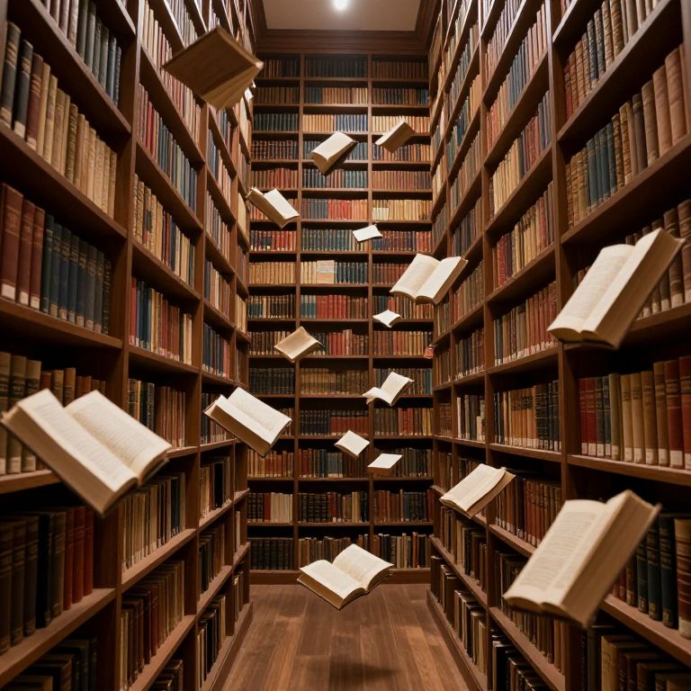 In a labyrinthine library where ancient spines rise like silent sentinels, books drift weightlessly through the air, their pages rustling softly with secrets untold, evoking a surreal dance between knowledge and mystery, freedom and confinement, and the timeless whispers of forgotten stories.