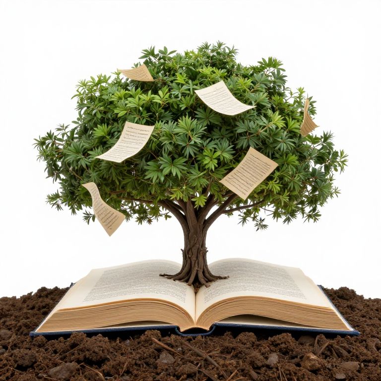 Digital illustration of a tree with green leaves growing from an open book, with pages floating in the air, set against a white background and rooted in dark