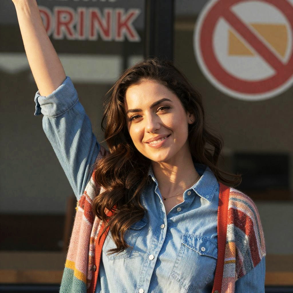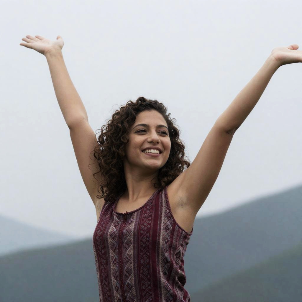 Photograph of a smiling woman with curly brown hair, wearing a sleeveless, patterned dark red top. She has her arms raised and extended, creating an expressive, joyful pose. Background shows a faint, overcast sky and blurred mountainous landscape.