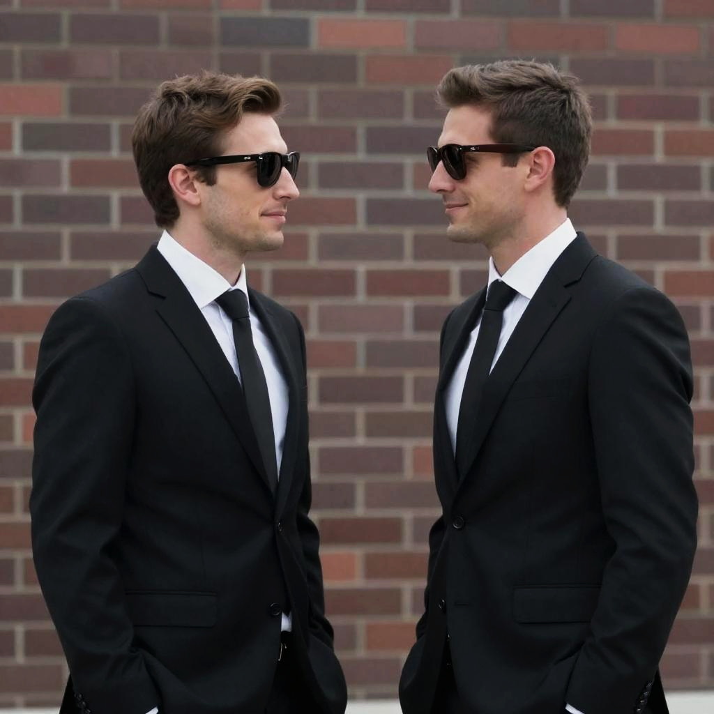 Two men in black suits with white shirts and black ties, wearing dark sunglasses, facing each other. Brick wall background. Both men have short brown hair, serious expressions, and slight smiles. They stand close, centered in the frame.