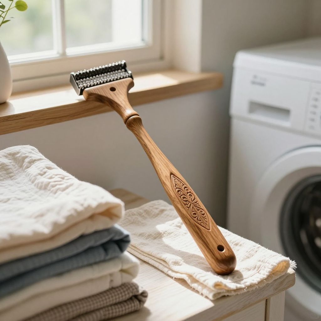 Cloth remover tool in a cozy, rustic laundry room, wooden handle with intricate carvings, surrounded by fresh folded fabrics and natural light streaming through a window, emphasizing warmth and homely atmosphere, soft textures, photorealistic