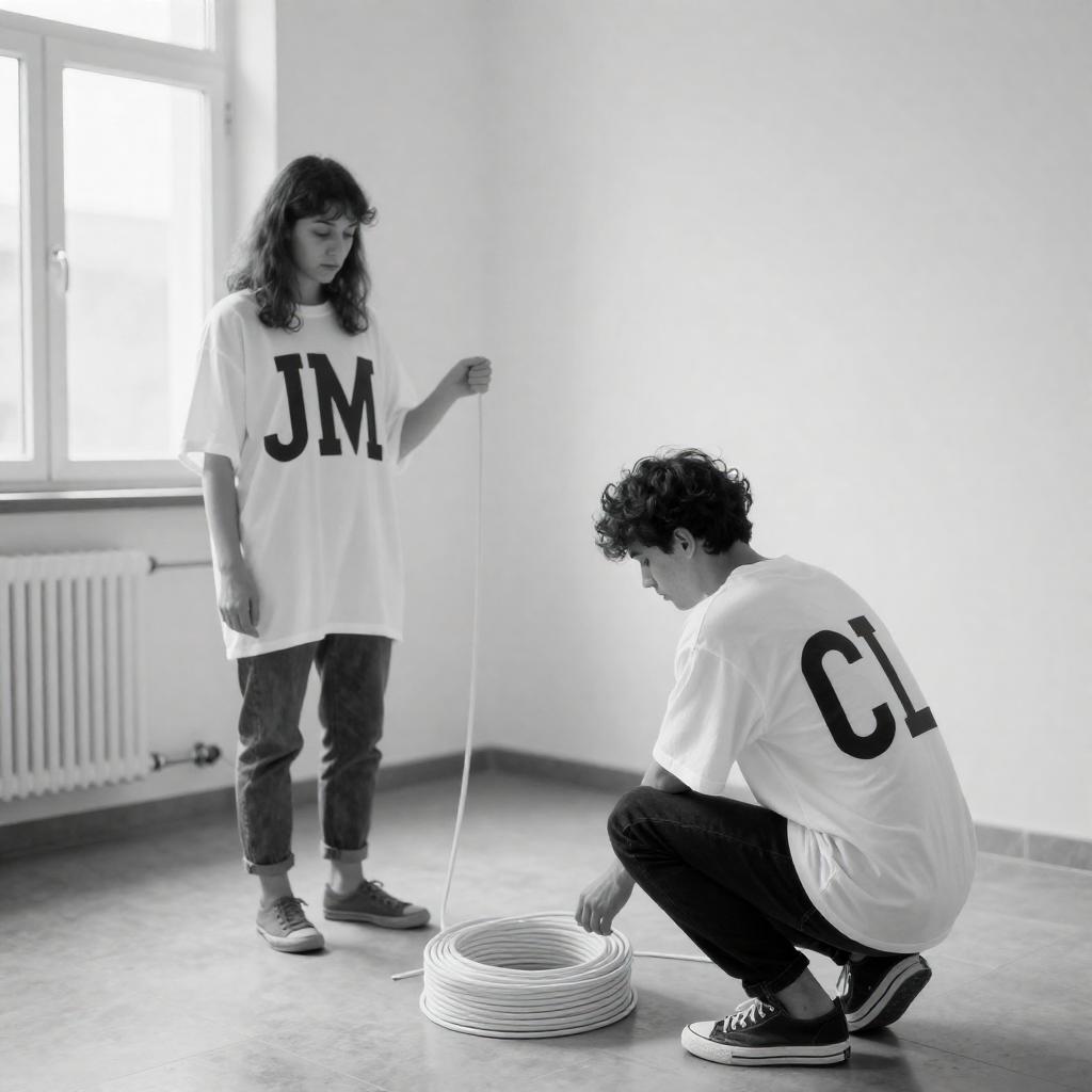 Black-and-white photograph of two people in oversized white shirts with large letters "JM" and "CL". One stands, holding a cord, while the other crouches on a tiled floor with a coil of white cord and radiator in the background. Bright window light from the left. Minimalist room.