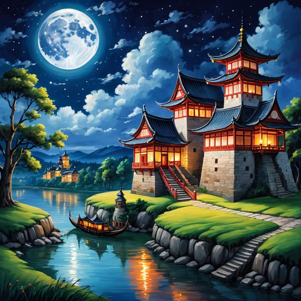 No humans, night, moon, scenery, outdoors, sky, full moon, traditional media, building, tree, water, night sky, painting (medium), house, lantern, cloud, tower, grass, architecture, castle, river, nature