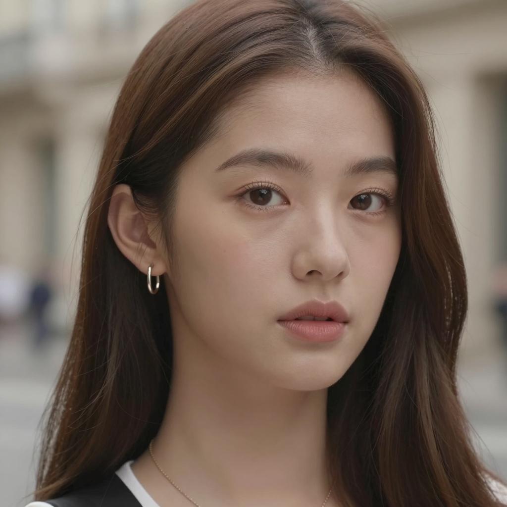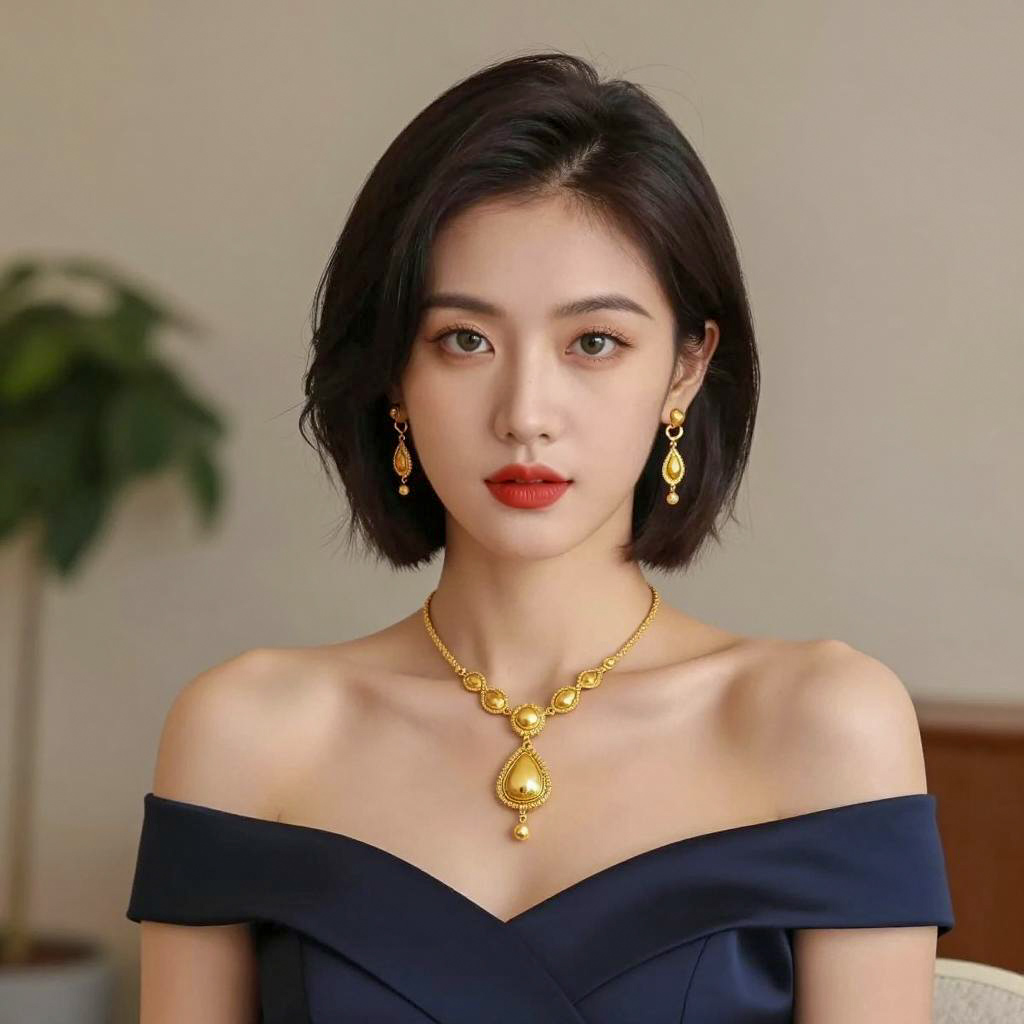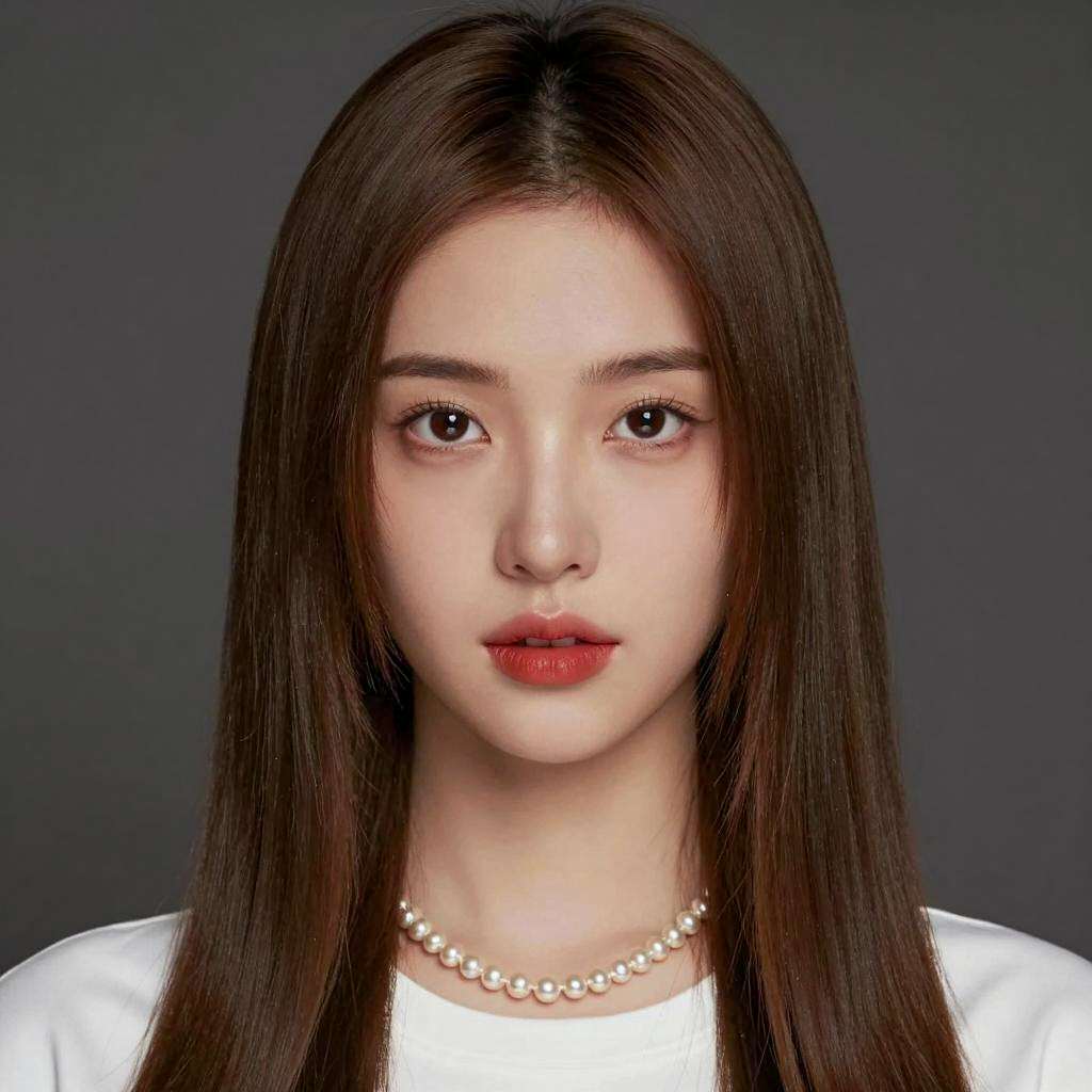 A close-up portrait of a young woman with long smooth brown hair styled back, wearing a dark teal top and a necklace with green leaves, soft natural lighting highlighting her flawless skin, realistic eyes with subtle makeup, elegant earrings, blurred background with warm tones, photorealistic style