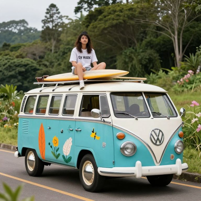Photograph of a young woman with long dark hair, wearing a white "LOVE HUGS" T-shirt and blue shorts, sitting on the roof of a vintage, turquoise and white Volkswagen van. She holds a yellow surfboard atop the van, which features colorful flower decals. The van is driving on a road with lush greenery and trees in the background. The sky is partly cloudy, and the road has yellow dividing lines. The woman's relaxed posture and the van's retro design evoke a carefree, adventurous vibe.