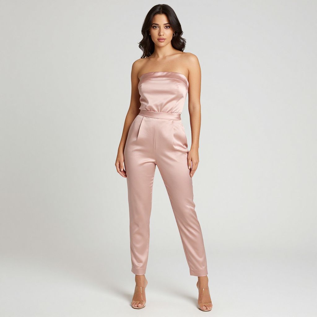 Photograph of a woman standing against a plain white background. She has long, dark wavy hair and a fair complexion. She is wearing a strapless, satin, light pink jumpsuit with a waist tie and high-waisted design. The jumpsuit has a smooth, shiny texture. She is also wearing nude-colored, open-toe high-heeled sandals. Her expression is neutral, and she is looking directly at the camera. The overall style is modern and elegant, emphasizing the chic, sophisticated look of the satin jumpsuit.