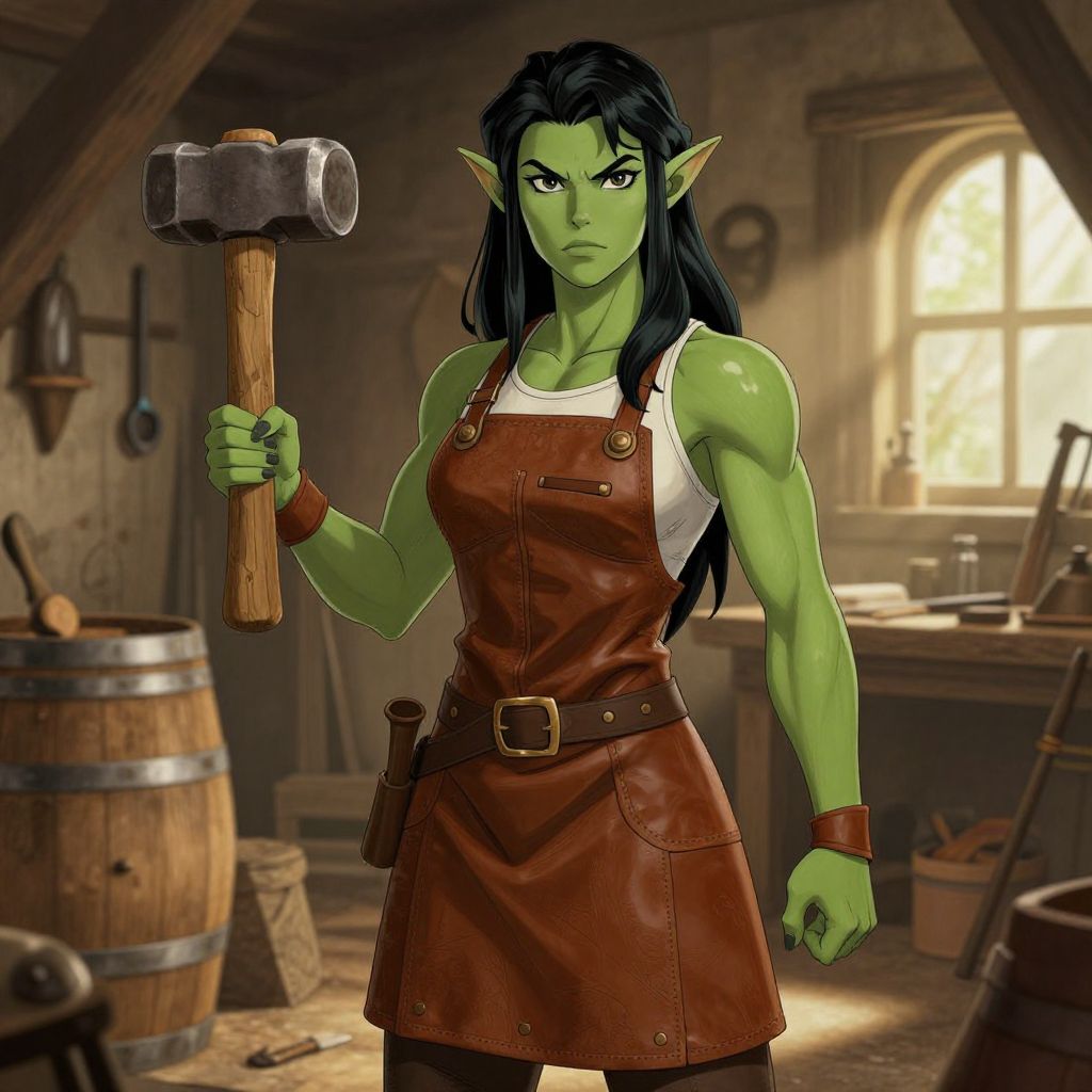 Digital drawing of a muscular green-skinned elf woman with long black hair, wearing a brown leather apron over a white tank top. She's holding a large wooden hammer in a dimly lit, rustic workshop with wooden barrels, tools, and a sunlit window in the background. She has a determined expression and pointed ears, standing confidently in the center.