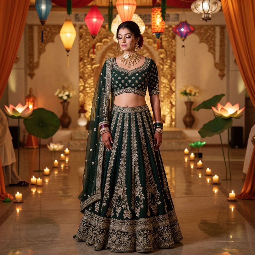 A glamorous bride in a custom dark green lehenga with silver embroidery and a fitted neckline, wearing a golden jhumka necklace, standing in a traditional wedding venue with colorful lanterns and lotus-themed décor, the costume catching the candlelight and reflecting off the polished floor, focused on the elegant silhouette of the lehenga.
