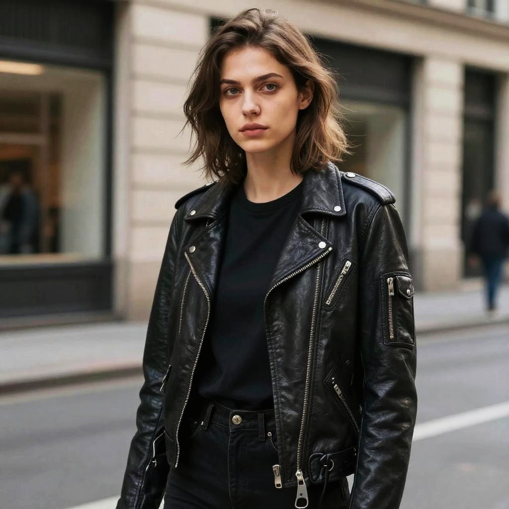Portrait of a young woman with long brown hair wearing a beige trench coat over a white turtleneck sweater and a dark patterned vest. She stands outdoors in an urban setting with a beige building and white cars blurred in the background. The woman has a neutral expression and looks directly at the camera.