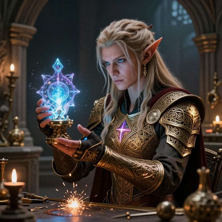 Portrait of a high elf artificer holding a shimmering arcane device, delicate filigree armor with glowing symbols, intense focus as sparks fly from tools, ambient light in an ancient stone laboratory filled with magical artifacts.