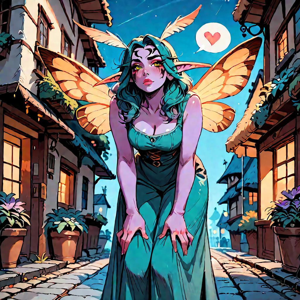 (score_9, score_8_up:1.3), night elf moth woman, antennae, wings, blush, lips, spoken heart, leaning forward, guh, glowing outline, cobblestone road, electric lettuce, town, moon, rating_safe, rating_questionable