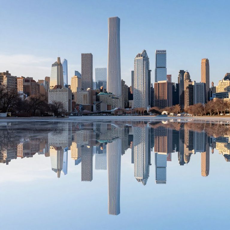 Photograph of a city skyline with tall skyscrapers reflected in a calm, clear body of water. The buildings vary in height and design, with a prominent, tall, white, cylindrical building in the center. The sky is bright blue, casting a clear light on the buildings, which have shades of brown, gray, and glass. Leafless trees are visible at the water's edge, and the reflection in the water is almost mirror-like, enhancing the symmetry of the scene. The overall composition emphasizes the contrast between the urban architecture and the natural water surface.