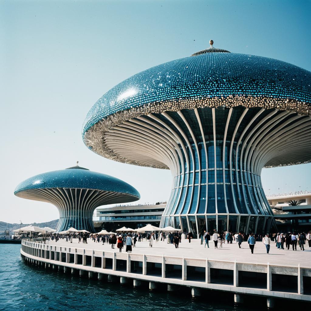 Magic Mushroom huge glittering contemporary cultural pavilion made of glass and porcelain, iconic architecture inspired by curved cliffs, located on the waterfront of a large Mediterranean downtown area