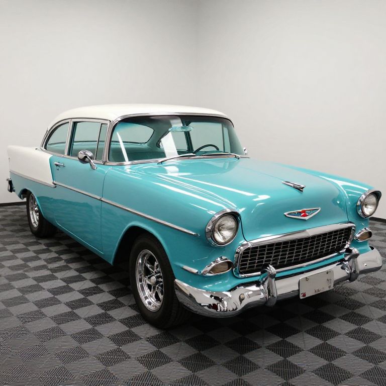 Shimmering turquoise 1955 Chevrolet Bel Air Special parked indoors on a checkered floor, showcasing its classic design with chrome accents, dual exhaust pipes, and a contrasting white roof.
