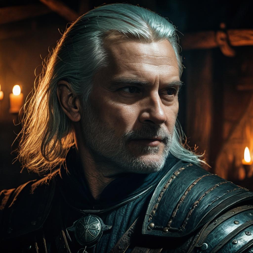 The Witcher character, close portrait with brooding intensity, medieval tavern background. Created by Frank Frazetta, with cinematic lighting by James Gurney.