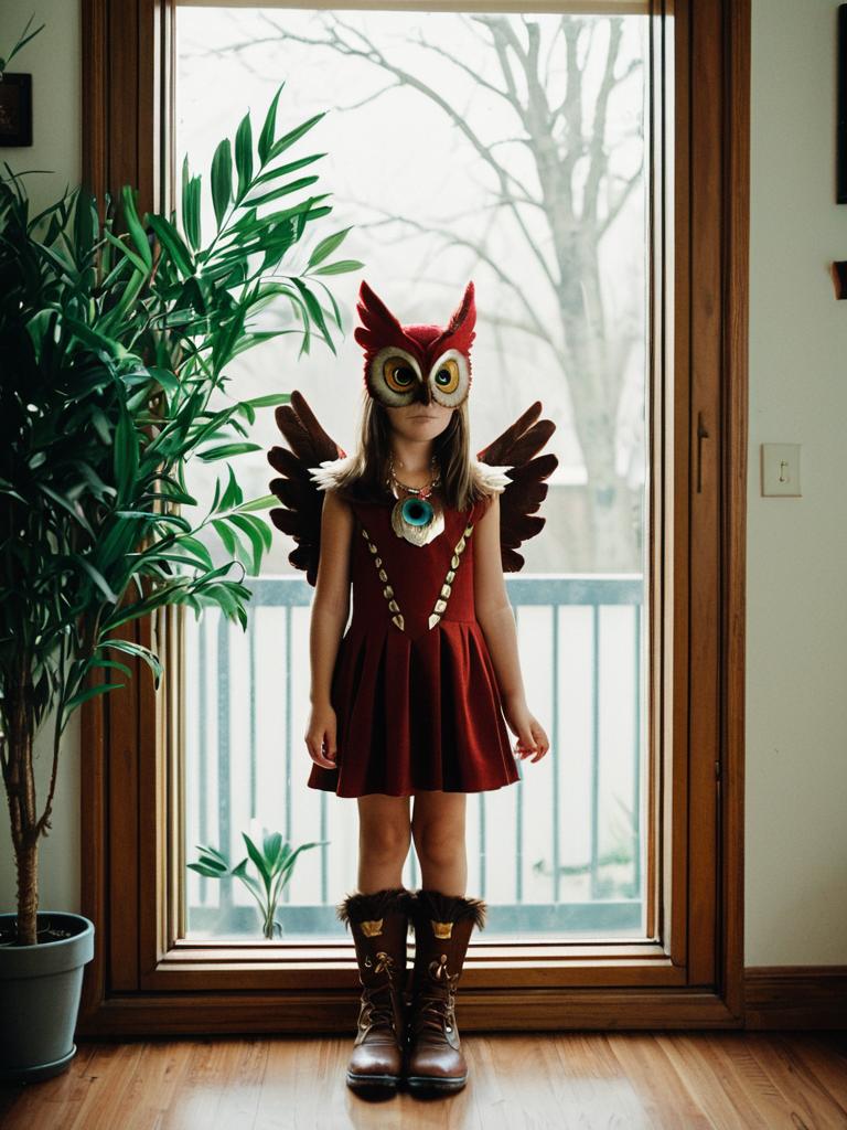 Girl in Owlette Costume Standing by Window