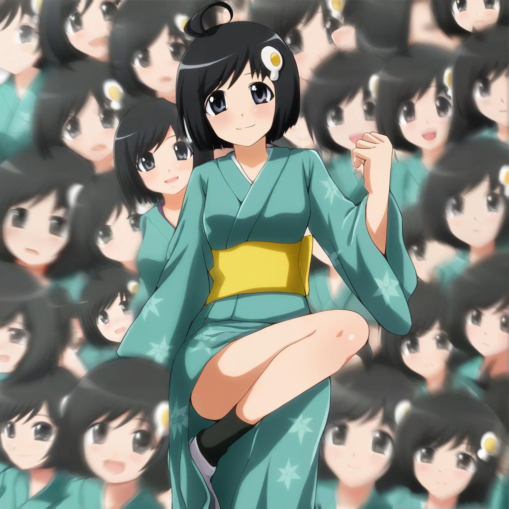Araragi tsukihi, monogatari (series), 1girl, black eyes, black hair, short hair, egg hair ornament, ahoge, by artist chima q, leet
