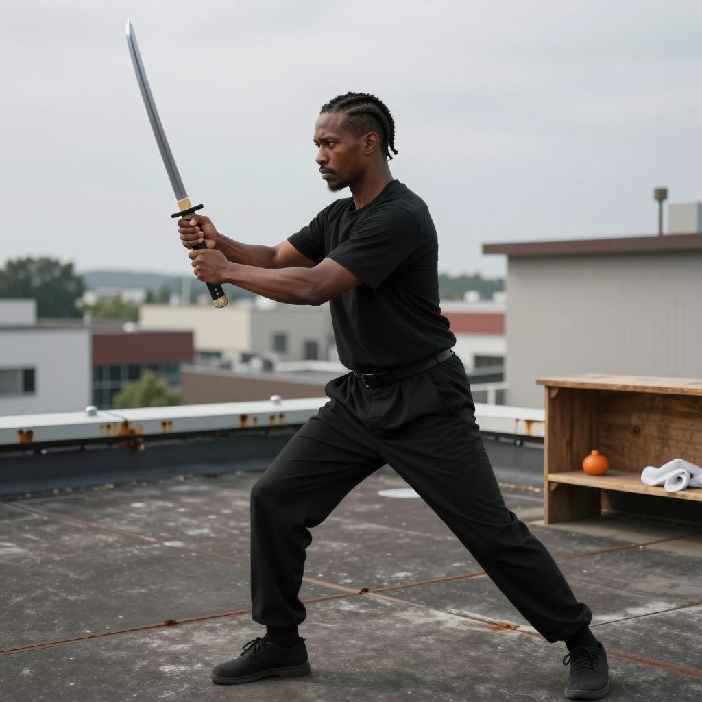 Old man with white hair, wearing a black sweater and blue jeans, gripping a sword, poised to swing. Intense expression. Stone building steps and black iron railing in the background. Bright sunlight. Garden with flowers at the bottom.