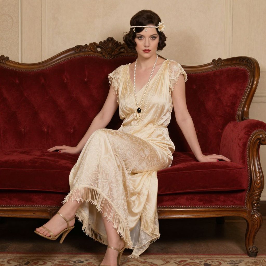 A woman in a vintage-inspired, cream-colored gown sits elegantly on a rich red velvet sofa with ornate wooden accents, exuding a classic 1920s aesthetic through its high-definition, painterly style reminiscent of early 20th-century portraiture.