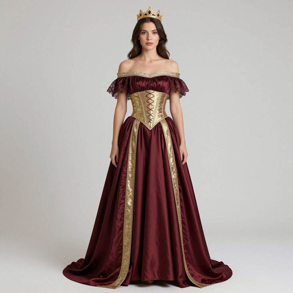 Photograph of a fair-skinned woman with dark, wavy hair, wearing a regal, off-the-shoulder, deep burgundy velvet gown with gold trim and an intricate gold corset bodice. She dons a gold crown with small jewels, positioned centrally on her head. The gown's fabric has a rich, luxurious texture, and the corset features detailed lace-up front. The background is a plain, light gray, highlighting the woman's elegant attire. She stands confidently, facing the camera, with a neutral expression. The image emphasizes her royal, fairy-tale-like appearance.