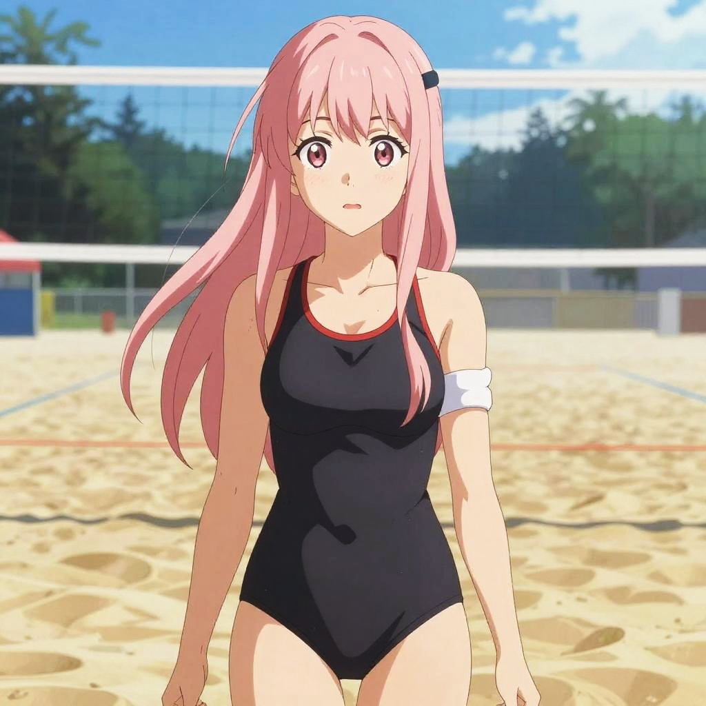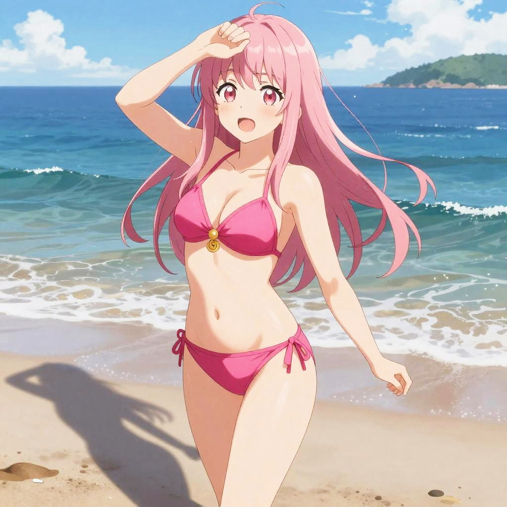 Zero Two swimsuit, vibrant anime style, detailed ocean background, dynamic pose with flowing hair, bright sunlight, beach setting, soft shadows and vivid colors