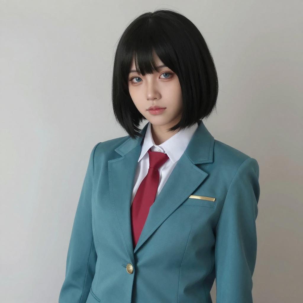 Portrait of a young East Asian woman with black bob haircut wearing a detailed teal blazer, white shirt, and red tie, styled as a realistic cosplay of the character Ritsuko Akagi from anime. The fashionable costume is complemented by subtle, refined makeup against a plain background.