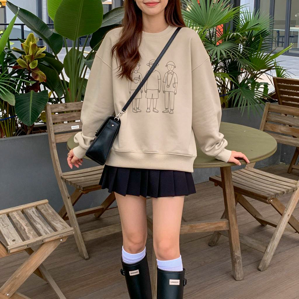 Young woman with long brown hair standing on wooden deck. Wearing beige sweatshirt with black line drawing of three people, black pleated skirt, white knee socks, black rain boots. Black crossbody bag over right shoulder. Green plants and wooden chairs with round tables in background. Hands resting on table edges. Light smile. Outdoor setting. Natural light.