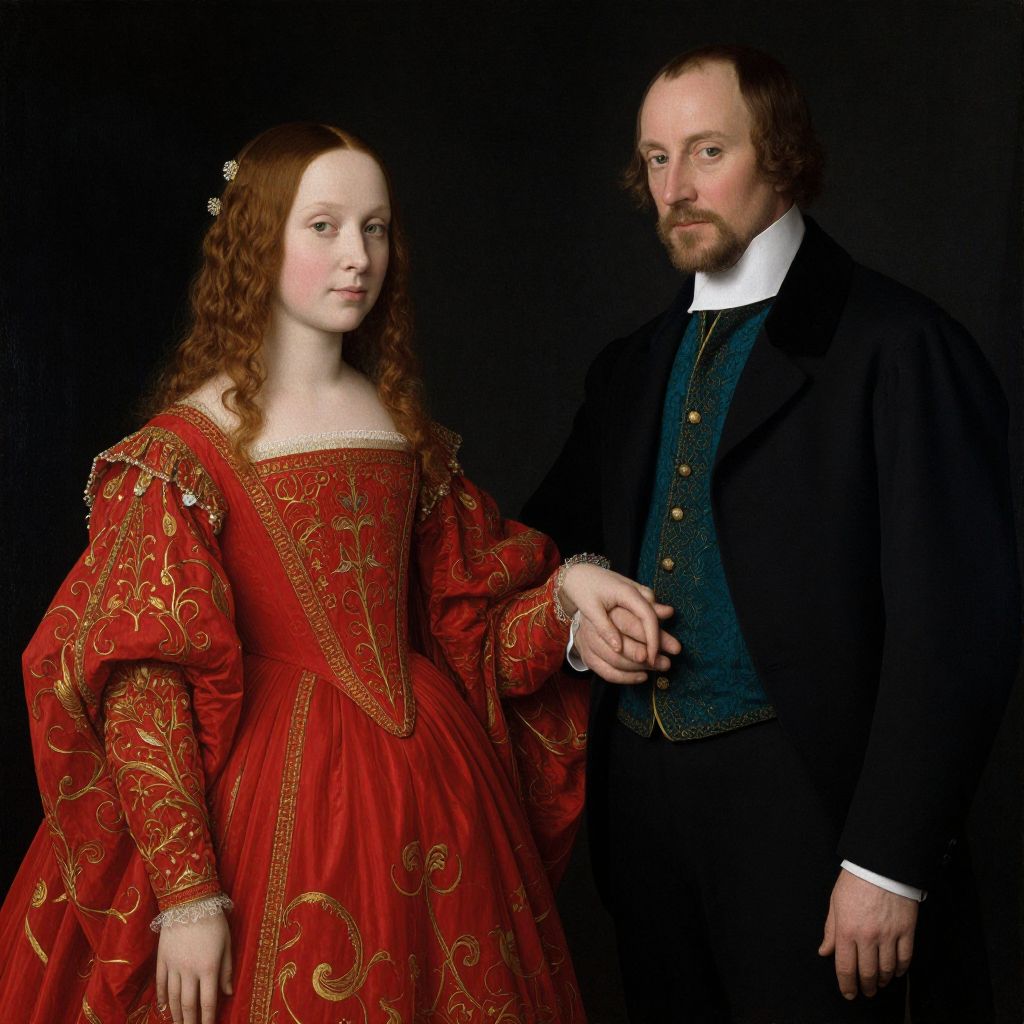 Two figures, a woman in a vibrant red gown adorned with intricate gold embroidery and a man in a formal black suit with a teal vest, stand side by side against a dark background, evoking the style and composition reminiscent of Jan and Hubert van Eyck's Renaissance paintings.