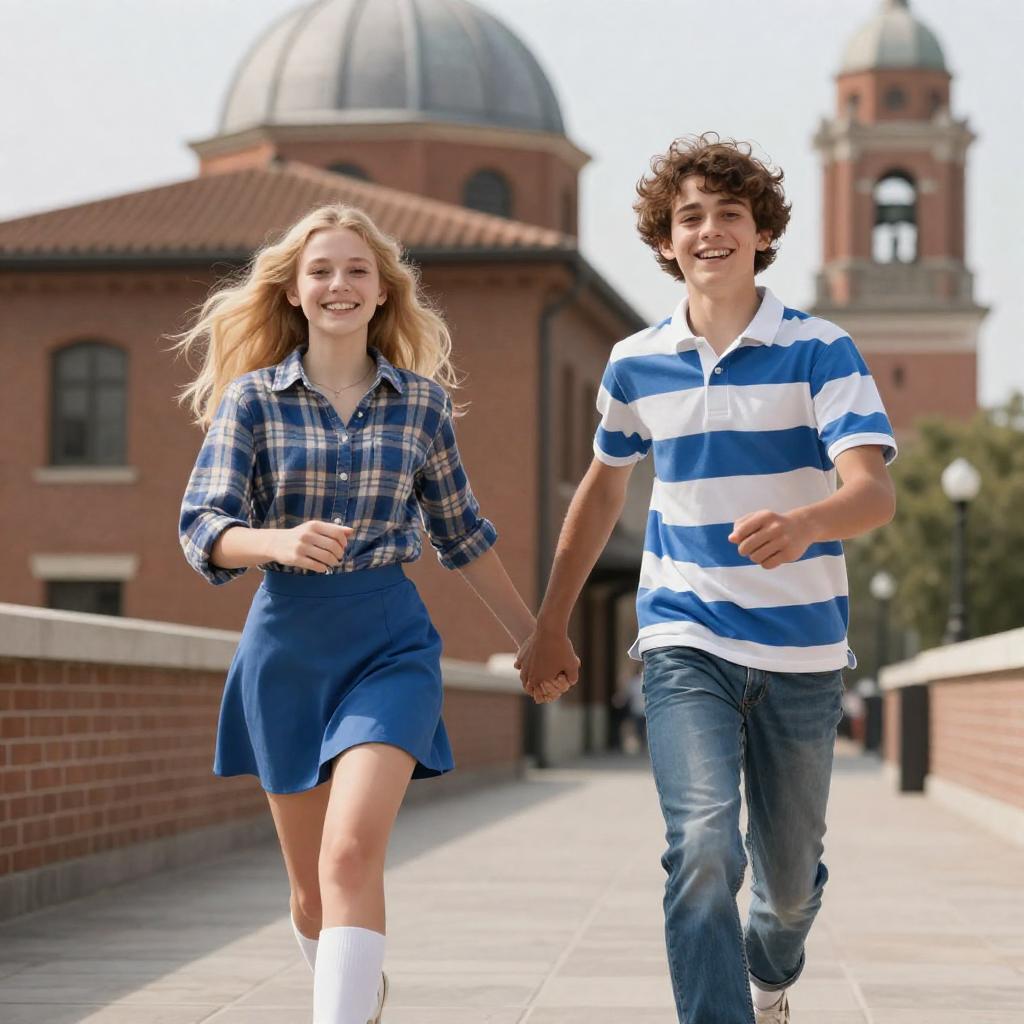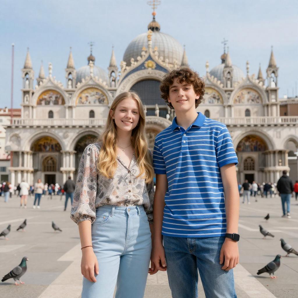 Photograph of two teenagers, a girl with long blonde hair and a boy with curly brown hair, sitting on a red boat. They are on a canal with a bridge in the background. The boy wears a blue and white striped shirt, the girl wears a plaid shirt. Both are smiling, the boy has his arm around the girl's shoulder. The boat has red upholstery.