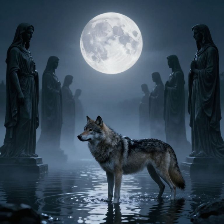 A moonlit wolf with a serpentine back stands solemnly in water, its gaze fixed on a row of statuesque figures cloaked in robes, their forms dissolving into the misty horizon beneath a luminous, oversized moon.
