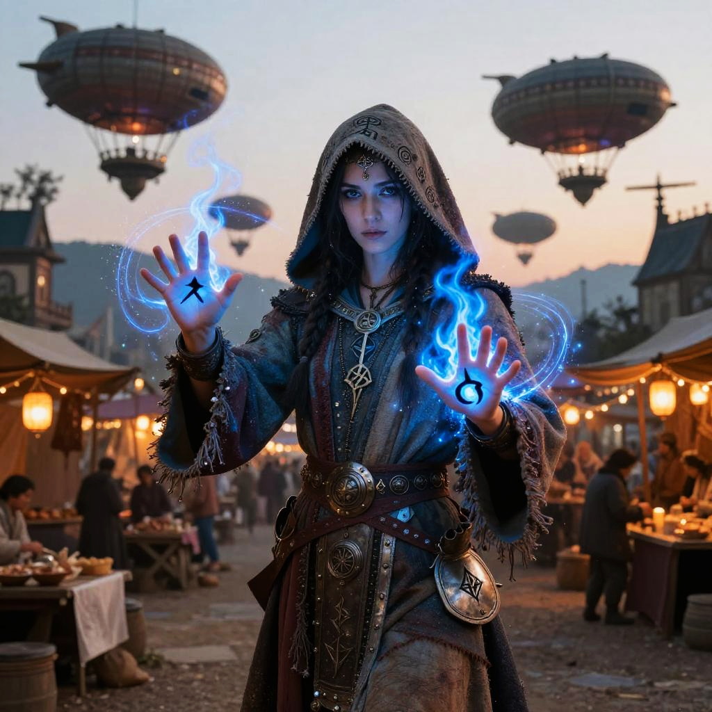TCG Artwork. A mystical sorceress casting a spell, with ink-black sigils burning with sapphire flame and silver motes spiraling outward radiating from her hands, wearing patched scholar's robe layered with arcane metallic plates and a rune-stitched hood, in a bustling floating market of enchanted airships at dusk, lanterns swaying on the breeze.