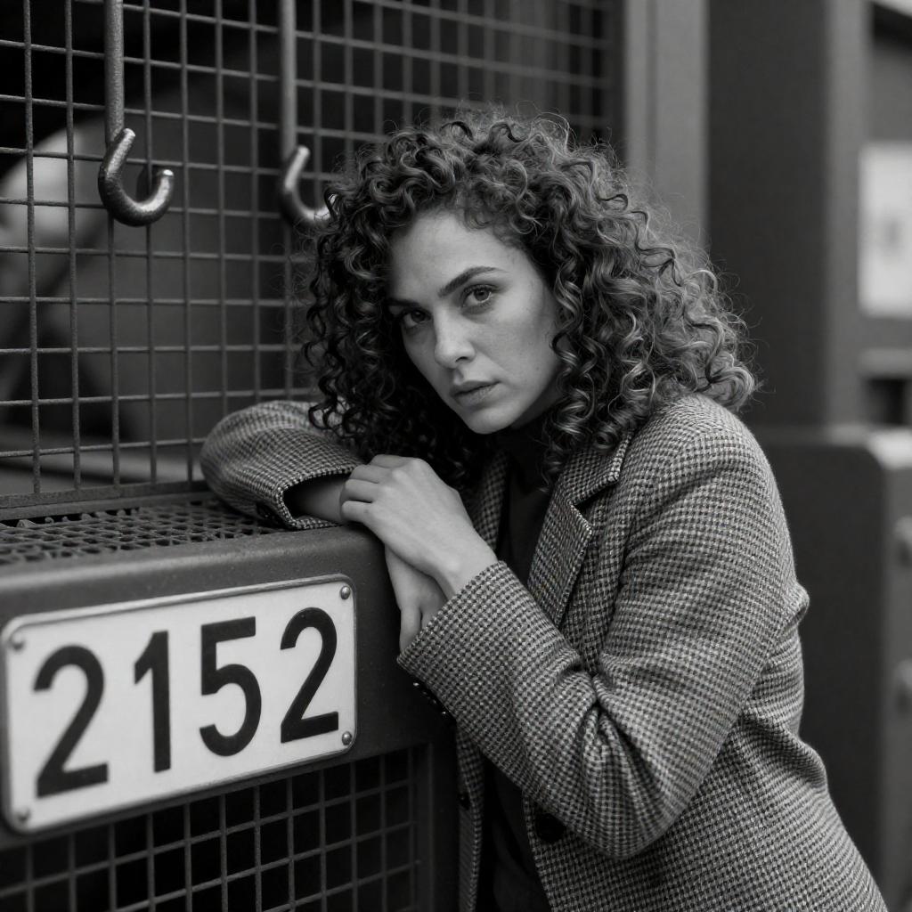 Black-and-white photograph of a woman with dark, voluminous hair and sunglasses, wearing a dark jacket and holding a spotted bag. She has dark lipstick and a bracelet on her right wrist. The background is blurred, featuring a car. Her expression is serious, and she is slightly leaning forward.