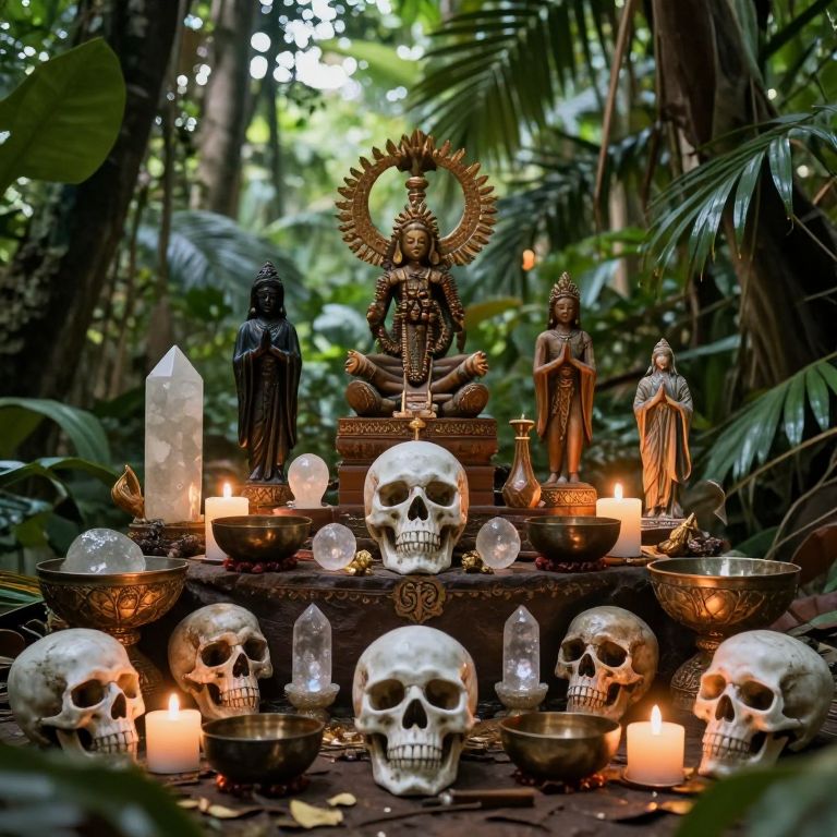 Santeria spiritual altar filled with crystal skulls, ritual bowls, symbolic statues and offerings, illuminated by flickering candles and natural light filtering through leaves, evoking a sacred and serene jungle ambiance.