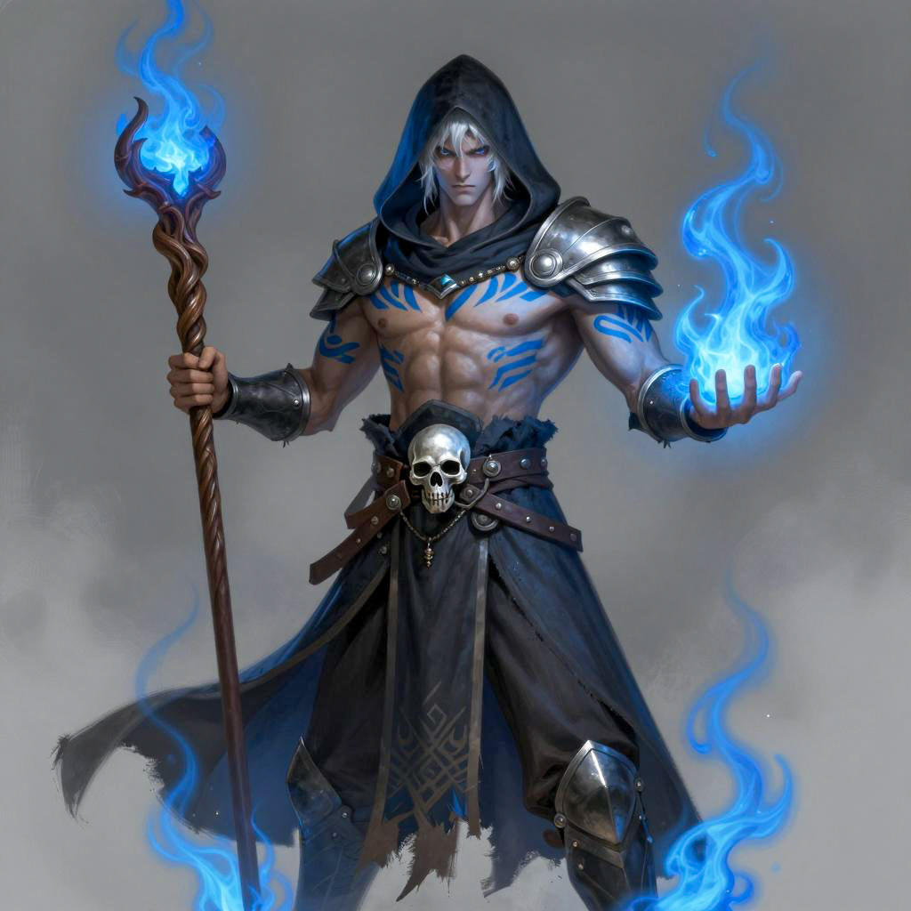 Digital illustration of a muscular male warrior with gray hair, intense expression, standing with sword in right hand, wearing dark armored gauntlets, red tattered cloak, black pants, and leather boots. He has a glowing blue light on his left hand. Dark gray background. Pivotal elements: red cloak, dark armor, sword, glowing blue light. Character is centered, facing forward, with sword slightly raised.