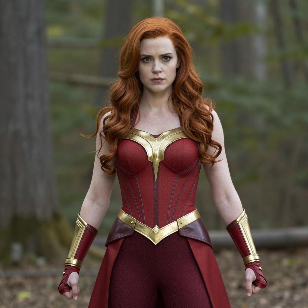 Cosplay dark phoenix fancy, photograph of redheaded woman in red and gold superhero costume, long wavy hair, serious expression, standing in forest, daylight, blurred trees and greenery in background, realistic, vibrant colors, high detail, comic book style, action pose, Emma Frost from X-Men