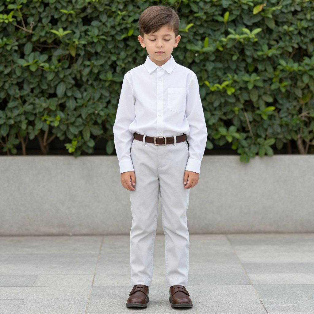 Photograph of a young boy standing in front of a lush green hedge. He has short, dark brown hair and a fair complexion, with his eyes closed and a neutral expression. He wears a crisp, white long-sleeve shirt, white pants, and a brown belt. His brown leather shoes are polished. The background includes a gray concrete wall beneath the hedge. The pavement he stands on is light gray and slightly textured. The image has a clean, bright, and formal aesthetic.