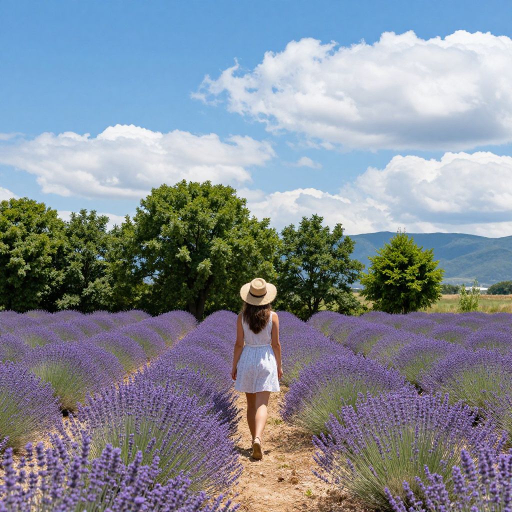 Woman strolling through rows of vibrant lavender under a bright blue sky dotted with fluffy clouds, framed by lush green trees and distant mountains.