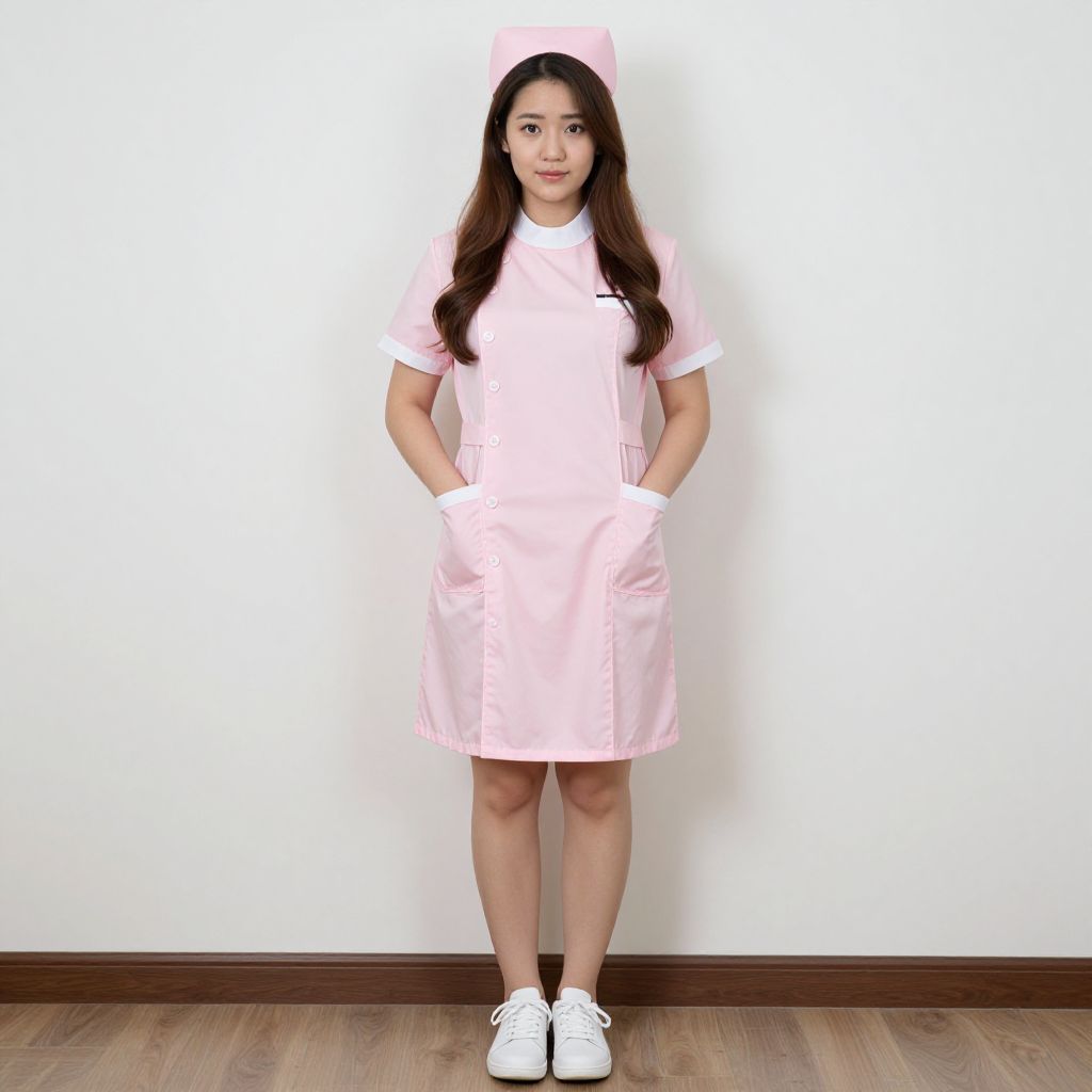 Photograph of a young Asian woman standing against a plain white wall with brown baseboards and wooden floor. She has long, straight black hair, fair skin, and wears a light pink nurse uniform with short sleeves, a modest V-neck, and pockets with hands in them. She also wears white sneakers and a matching pink nurse cap. Her expression is neutral, and she stands with a slight forward lean. The image is brightly lit, emphasizing the pastel color of her outfit and the simplicity of the setting.