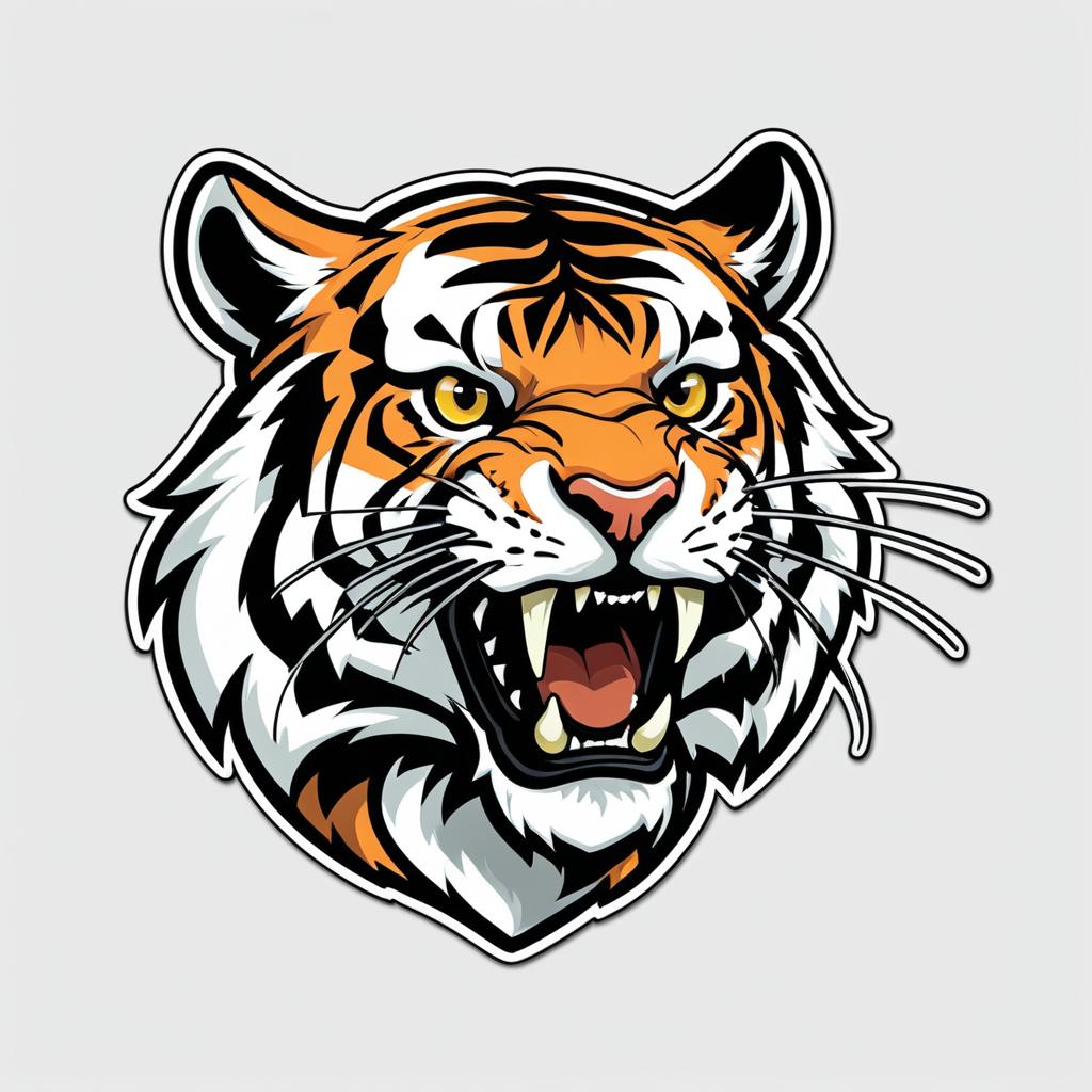 A cartoon-style die-cut sticker of a fierce tiger character. Vector line art, clean outlines, flat colors, HDR, 16K resolution, monochrome background, crisp and modern aesthetic