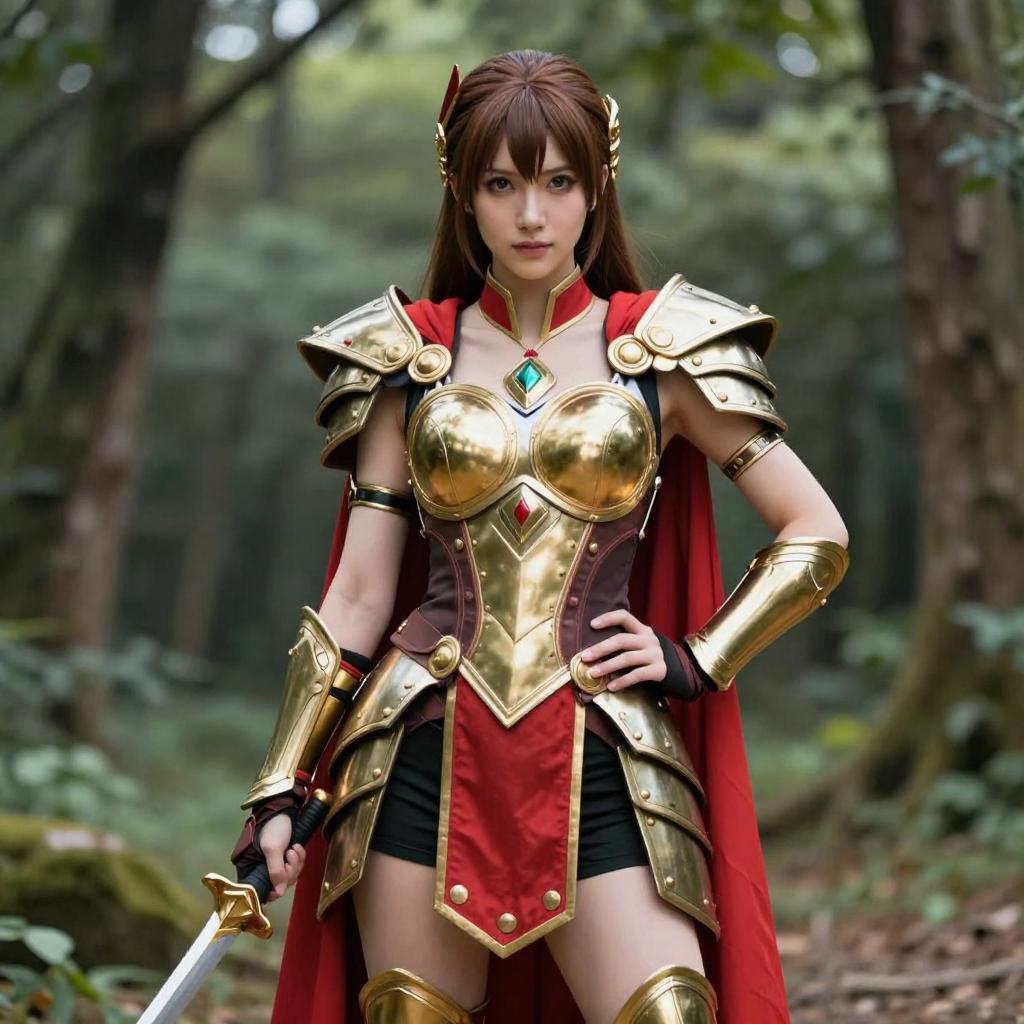 A woman dressed in a realistic cosplay costume of Athena Asamiya from the King of Fighters series poses confidently in an outdoor forest setting. The detailed armor features gold accents and a red cape, capturing the character's iconic warrior look with a modern, polished style.