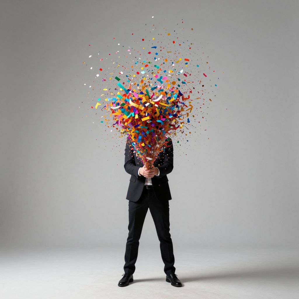 A man in a suit stands against a minimalist backdrop, releasing a vibrant burst of colorful confetti that disperses like a celebration, evoking a sense of joy and imagination through its digital artistry and dynamic visual effect.