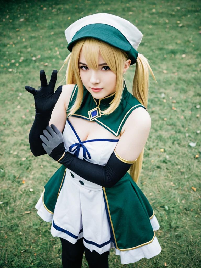 Photo-realistic cosplay photo of person in artoria caster (first ascension) (fate) costume. 1girl, green eyes, hair between eyes, blonde hair, long hair, twintails, ahoge, small breasts, grey gloves, hat, grey headwear, sleeveless dress, white dress, bare shoulders. full body shot