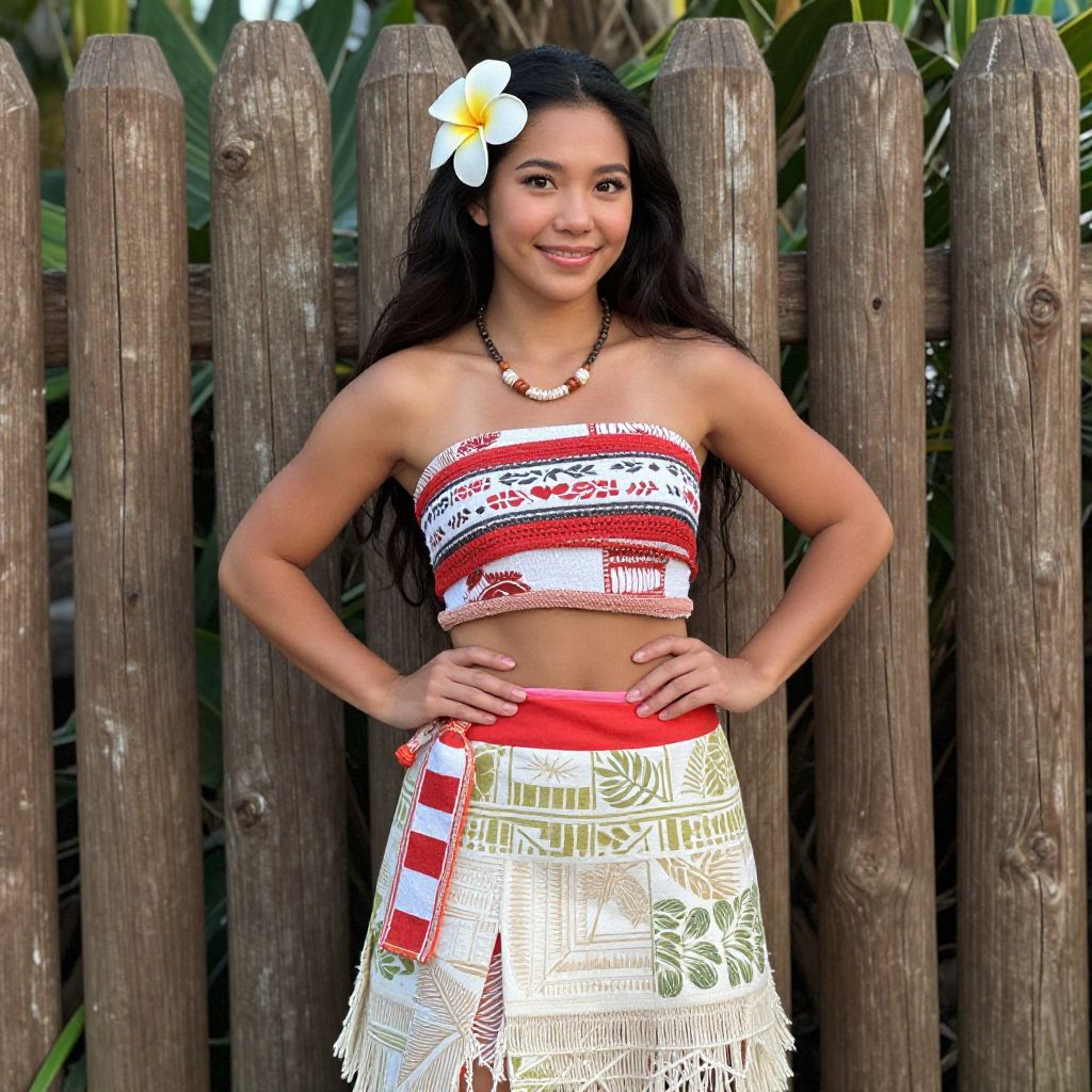 A woman dressed in a realistic Moana character costume poses confidently against a wooden fence. She has long dark hair adorned with a large flower, and her outfit features traditional Polynesian-inspired patterns and accessories, capturing the essence of the Moana cosplay style.