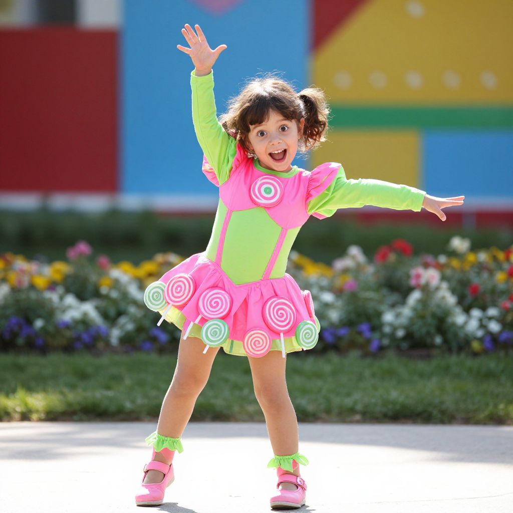 A detailed, candid-style photo of a child in a playful lollipop dance costume, with a pink and green outfit featuring lollipop-shaped decorations all over their body, standing in a sunny park with flowers and a colorful backdrop, face glowing with excitement, large round eyes, and a mischievous smile.