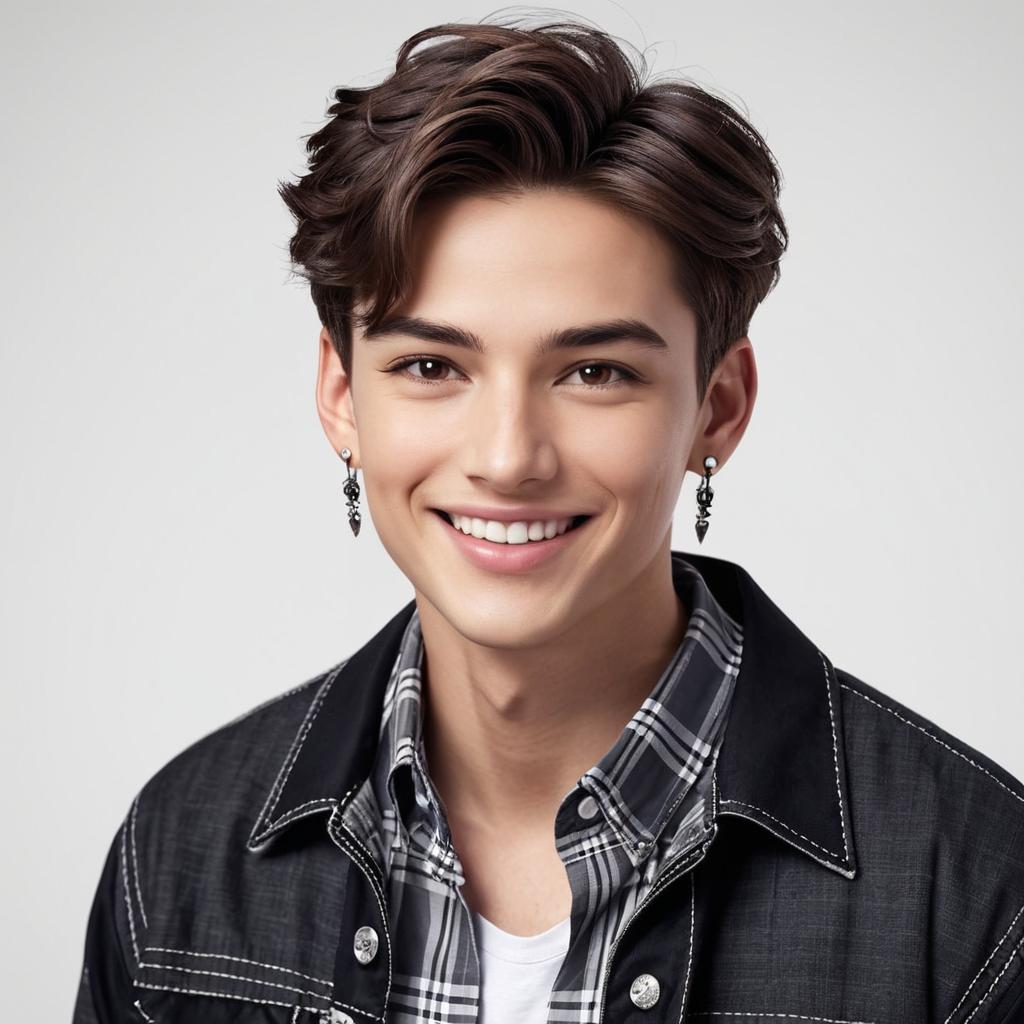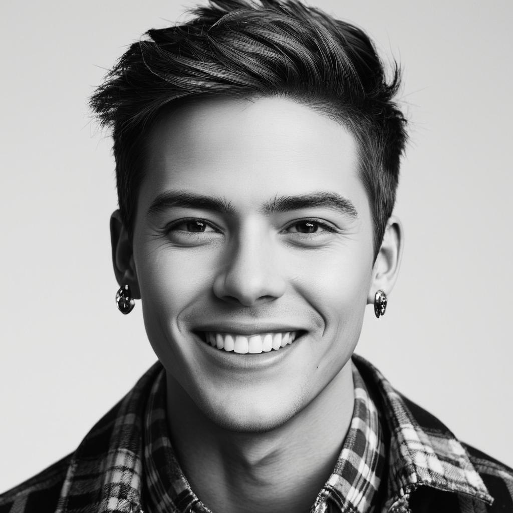 Black and white portrait of a young man with short dark hair smiling at the camera. He is wearing a plaid button-up shirt over a plain t-shirt and has a small hoop earring in one ear. The background is simple and light-colored, emphasizing his facial expression and casual outfit.